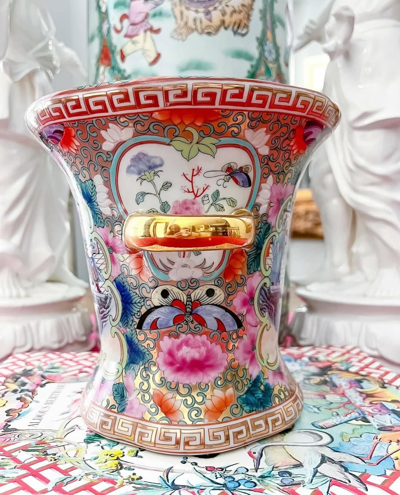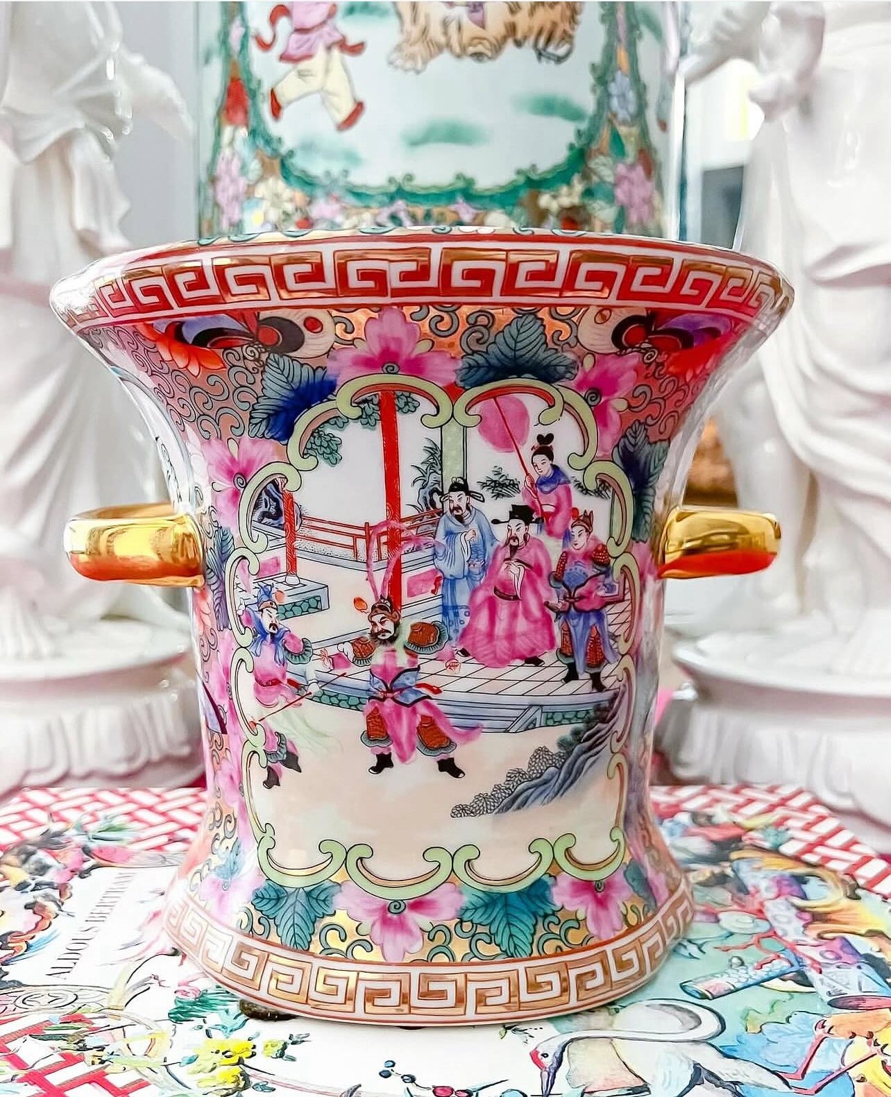 Vintage rose medallion cachepot. Gorgeous colors, Greek key detail, with gold accents. There are so many end use possibilities- florals, chilling wine, kitchen utensils, just to name a few. Excellent vintage condition. Stamped on bottom. 7.25”w 7”h.